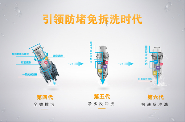 此次榮事達(dá)智能前置過濾器系列所帶來的最大不同,便是其獨有的“防堵免拆洗技術(shù)”。作為企業(yè)定向研發(fā)的專利技術(shù),有效解決了前三代傳統(tǒng)前置過濾器“易堵塞,拆洗難”的致命弊病,五款新品從第四代到第五代再到第六代,可以說是防堵免拆洗技術(shù)的梯度升級。