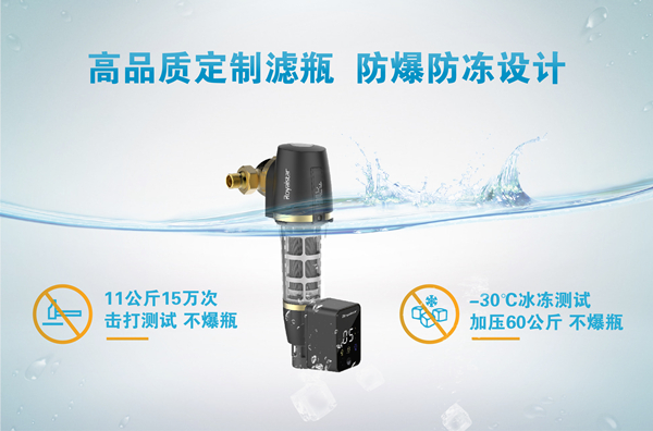 對于傳統(tǒng)前置過濾器來說一直存在一個隱患,那就是在低溫冰凍或是高壓水錘等情況下,容易引發(fā)濾瓶爆裂,令許多用戶頭疼不已。其實,回歸根本來說,還是因為濾瓶材質(zhì)不佳。榮事達(dá)為攻克這一難題,可謂是下足功夫。智能前置過濾器濾瓶采用獨特配方和原裝進(jìn)口材料,不含雙酚A,濾瓶無注塑點,并通過NSF、SGS檢測,經(jīng)過改性配方與防爆防凍極限抗壓測試,11公斤15萬次擊打不爆瓶,-30℃冰凍測試加壓60公斤不爆瓶,濾瓶綜合性能有著質(zhì)的飛躍,保證用戶使用安心。