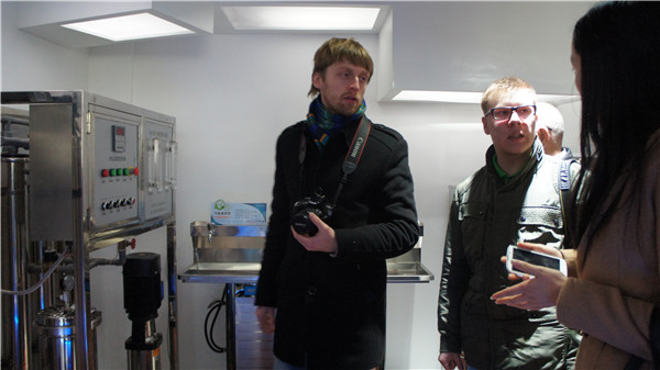 在榮事達家電研發(fā)中心二樓展廳,色彩紛呈、形態(tài)各異的凈水產(chǎn)品引得許多乘客注目凝視。出于對自動售水機的好奇,考察團許多成員一進門便被吸引過去,通過介紹,他們紛紛夸這個大家伙方便好用??吹骄缕恋摹懊?、蘭、竹、菊”純水機時,兩名俄羅斯女士不禁用英語單詞“nice”表達了自己的喜愛之情。