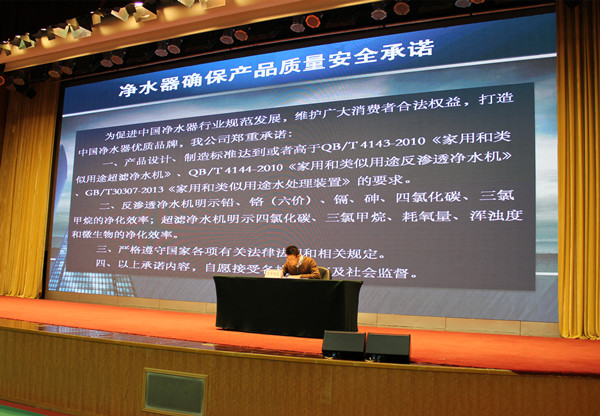 12月12日,合肥榮事達、浙江沁園、北京碧水源以及上海浩澤等18家凈水器生產(chǎn)企業(yè)代表齊聚國家質(zhì)檢總局,共同向社會做出質(zhì)量安全承諾,公開承諾:嚴格遵守國家各項有關法律法規(guī)和相關規(guī)定,接受社會監(jiān)督,產(chǎn)品設計、制造標準達到或者高于有關國家和行業(yè)標準要求,并明示對鉛、砷、四氯化碳、三氯甲烷等有害物質(zhì)的凈化效率。本次活動是質(zhì)檢總局推動企業(yè)標準自我聲明的一次重要活動。