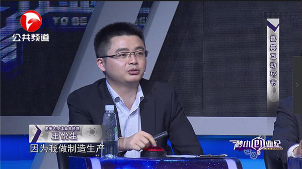 在5月12日播出的節(jié)目中,王悅生總經(jīng)理與其他在場嘉賓一同聆聽了三位選手的創(chuàng)業(yè)項(xiàng)目及融資計(jì)劃。王總結(jié)合自己豐富的項(xiàng)目運(yùn)營及市場運(yùn)作經(jīng)驗(yàn),幫助選手分析項(xiàng)目市場前景、投資價(jià)值和未來發(fā)展方向,并針對(duì)項(xiàng)目的運(yùn)作模式、產(chǎn)品的規(guī)范化生產(chǎn)等方面提出了專業(yè)的、極具參考價(jià)值的建議,助力選手實(shí)現(xiàn)品牌發(fā)展與財(cái)富積累的最大價(jià)值,得到了現(xiàn)場嘉賓、參賽者、觀眾的一致認(rèn)可,掌聲不斷。