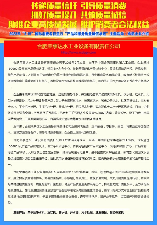 榮事達(dá)水工業(yè)公司將繼續(xù)做好產(chǎn)品和服務(wù),以質(zhì)量和口碑促進(jìn)品牌魅力的持續(xù)提升,為更多消費(fèi)者健康飲水提供優(yōu)質(zhì)服務(wù)。