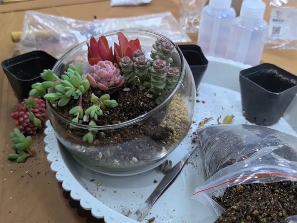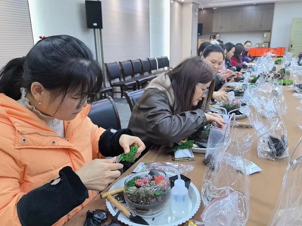 在DIY過(guò)程中,大家互相交流、分享心得,笑聲和談話聲此起彼伏。有的女神選擇了簡(jiǎn)約風(fēng)格,將多肉植物種植在小巧精致的花盆里,展現(xiàn)出一種清新脫俗的美;有的則選擇了色彩豐富的搭配,將不同顏色的多肉組合在一起,創(chuàng)造出一幅幅生動(dòng)的畫面。