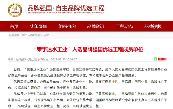 日前,“榮事達(dá)水工業(yè)”經(jīng)過(guò)資質(zhì)審核、輿情監(jiān)控等層層篩選,成功入選為品牌強(qiáng)國(guó)優(yōu)選工程智能設(shè)備行業(yè)優(yōu)選成員單位,企業(yè)信息錄入品牌強(qiáng)國(guó)優(yōu)選工程數(shù)據(jù)庫(kù),在權(quán)威平臺(tái)向公眾展示品牌形象。