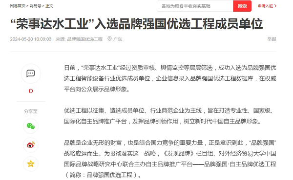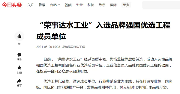 - 5月20日,發(fā)現(xiàn)品牌官網(wǎng)、品牌強(qiáng)國(guó)優(yōu)選工程官網(wǎng)、網(wǎng)易、今日頭條發(fā)表了“‘榮事達(dá)水工業(yè)’入選品牌強(qiáng)國(guó)優(yōu)選工程成員單位”的文章,文中肯定了榮事達(dá)水工業(yè)以創(chuàng)新為驅(qū)動(dòng),以綠色制造為己任,不僅深耕國(guó)內(nèi)市場(chǎng),更在國(guó)際舞臺(tái)上展現(xiàn)中國(guó)制造的魅力的大作為、強(qiáng)擔(dān)當(dāng)。