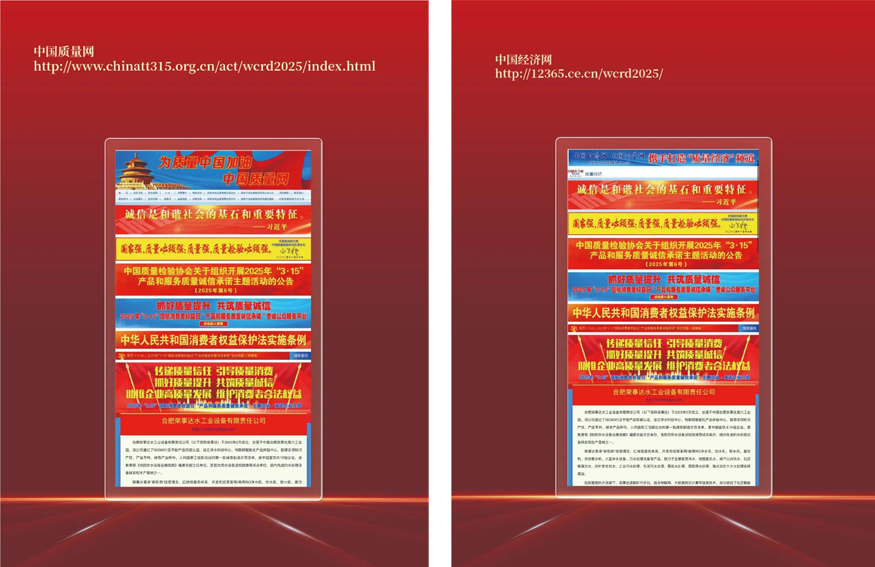 在由中國質(zhì)量檢驗協(xié)會主辦的2025年“3.15”產(chǎn)品和服務(wù)質(zhì)量誠信承諾的主題活動中,榮事達(dá)水工業(yè)公司憑借卓越的產(chǎn)品品質(zhì)及良好的社會形象,獲得協(xié)會以及專家的一致認(rèn)可,榮膺“全國行業(yè)質(zhì)量領(lǐng)先品牌” “全國產(chǎn)品和服務(wù)質(zhì)量誠信承諾企業(yè)” “全國消費者質(zhì)量信譽(yù)保障產(chǎn)品” “全國質(zhì)量檢驗穩(wěn)定合格產(chǎn)品”多項榮譽(yù),并在中國質(zhì)量網(wǎng)、中國經(jīng)濟(jì)網(wǎng)、中國產(chǎn)品質(zhì)量信譽(yù)網(wǎng)等多家媒體上集中展示和公告。