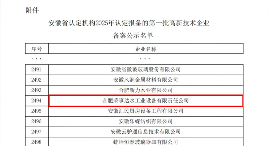 合肥榮事達(dá)水工業(yè)設(shè)備有限責(zé)任公司通過高新技術(shù)企業(yè)認(rèn)定,榮獲由安徽省工業(yè)和信息化廳、安徽省財(cái)政廳、國(guó)家稅務(wù)總局安徽省稅務(wù)局聯(lián)合頒發(fā)的《高新技術(shù)企業(yè)證書》,這一認(rèn)可,標(biāo)志著公司在技術(shù)創(chuàng)新、成果轉(zhuǎn)化及核心競(jìng)爭(zhēng)力建設(shè)方面邁上新臺(tái)階。