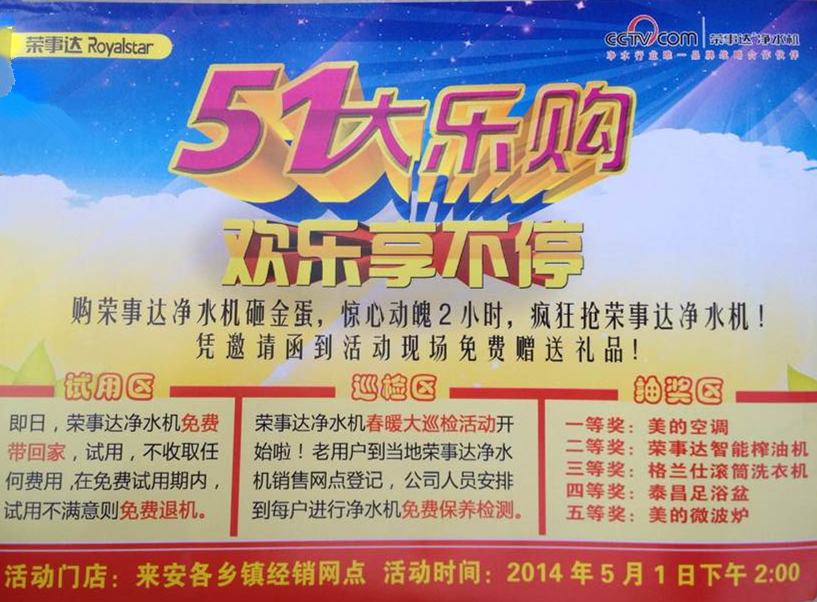 超低折扣購機——五一期間,榮事達推出了一系列購機優(yōu)惠政策,消費者在當(dāng)?shù)亟?jīng)銷商門店或者小區(qū)推廣點購買榮事達凈水產(chǎn)品,可享受超低折扣。