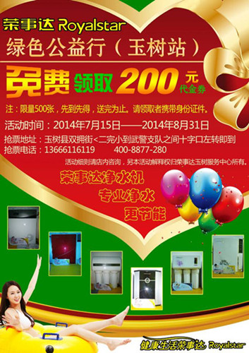 為實(shí)現(xiàn)“讓中國人喝上安全水”的夢想,榮事達(dá)水工業(yè)公司將在全國開展 “綠色公益行”活動,通過一系列為民、惠民的宣傳和服務(wù),關(guān)注居民飲水健康,倡導(dǎo)綠色生活。