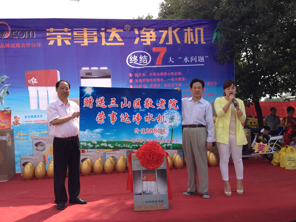 榮事達水工業(yè)公司一直踐行公益,關注社會弱勢群體飲水安全,蕪湖營銷管理中心自成立以來,開展了各種形式的公益活動。7月上旬,榮事達凈水機攜手蕪湖市老年協(xié)會到三山敬老院進行慰問演出,為老人們奉上了精彩的歌舞表演,給他們帶去了歡樂,并向該院捐贈了凈水機,讓老人們能喝上放心水。