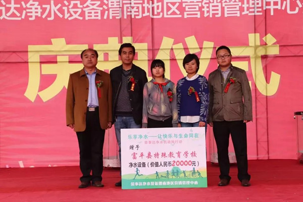 2015年伊始,榮事達(dá)水工業(yè)公司與安徽省青年志愿者協(xié)會共同發(fā)起了“樂享凈水——讓快樂與生命同在”助殘公益項目,活動一經(jīng)發(fā)起就受到了各地代理商的積極響應(yīng),截止目前,累計向康復(fù)中心、特殊學(xué)校、助殘機(jī)構(gòu)等350多個單位捐贈凈水設(shè)備2000多套,受惠人口超過50000人。除此之外,代理商們還主動為社會其他人群提供幫助,遼寧遼陽代理商就為當(dāng)?shù)丨h(huán)衛(wèi)工人設(shè)置榮事達(dá)飲水站,解決其工作期間的飲水問題;江蘇大豐舉行了“關(guān)愛生命,凈享水源”百村助民活動,當(dāng)?shù)卮砩桃罁?jù)實際情況為各村鎮(zhèn)服務(wù)機(jī)構(gòu)安裝凈水機(jī),方便村民接水飲用。