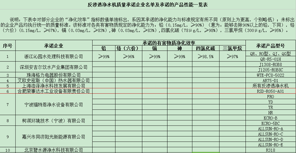 圖為部分反滲透凈水機(jī)質(zhì)量承諾企業(yè)名單及承諾的產(chǎn)品性能一覽表