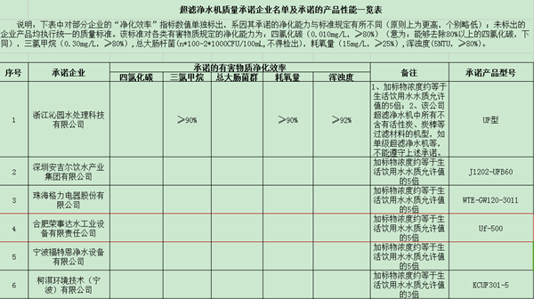 圖為部分超濾凈水機(jī)質(zhì)量承諾企業(yè)名單及承諾的產(chǎn)品性能一覽表